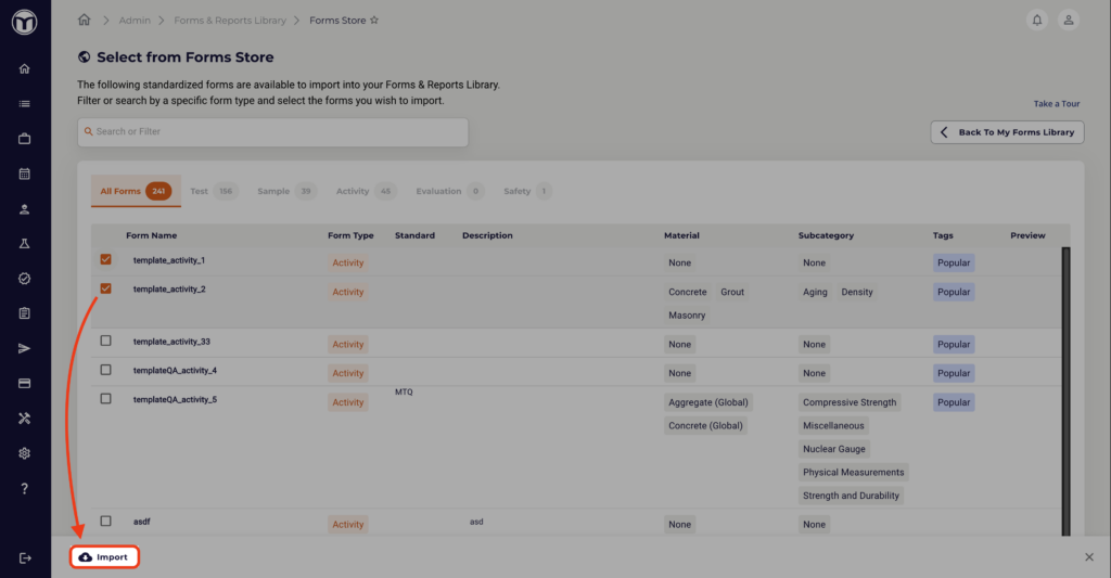 To import a new form to your environment, click its checkbox, then press the Import button at the bottom of the page. This will make the form available for use in your projects: