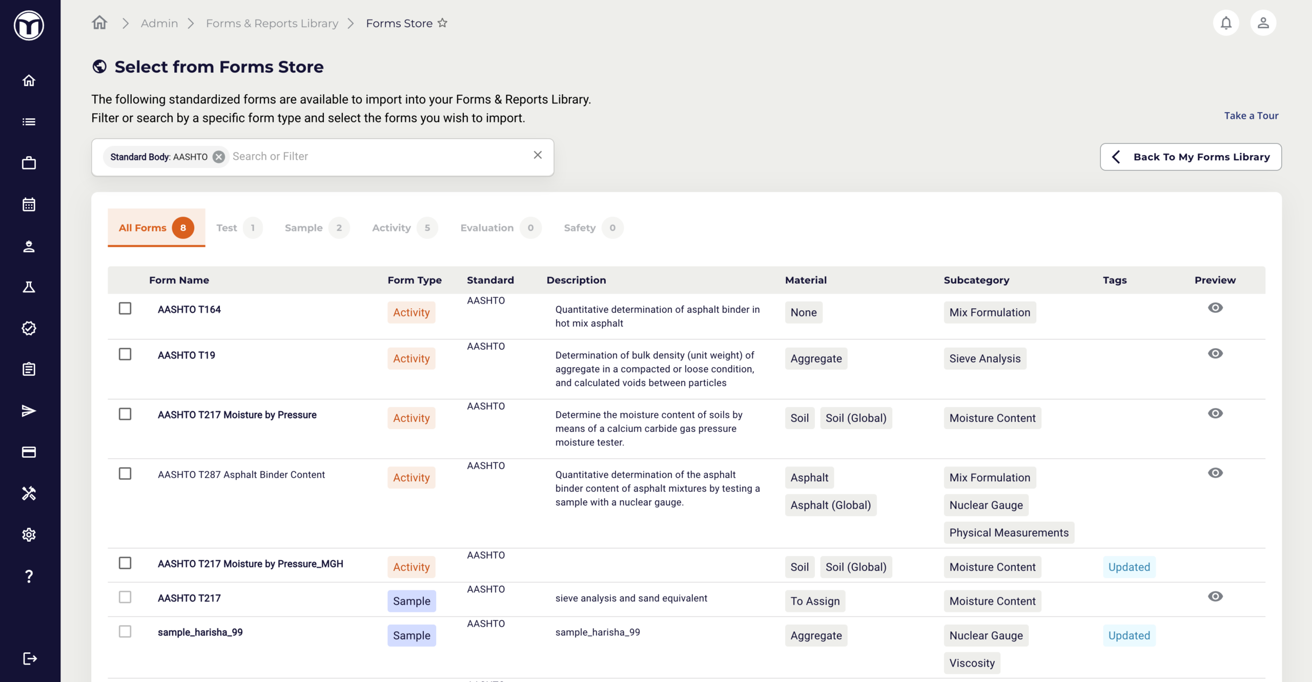 - Click the form tabs (Test, Sample, Activity) to filter to a specific type