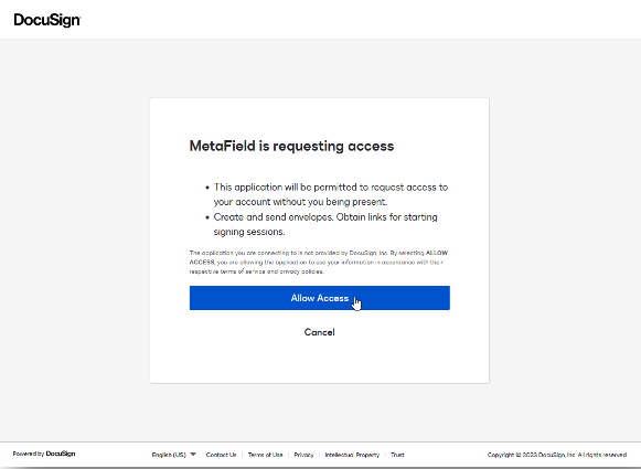 You will now need to provide MetaField consent to connect to DocuSign.