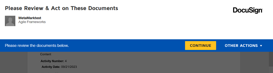 Step 2. Upon selecting Finalize Report, you will be moved directly into DocuSign. Select Continue in the ribbon to begin the signing process.