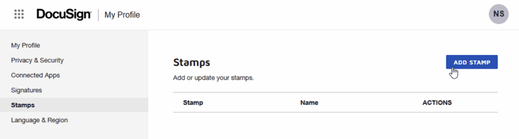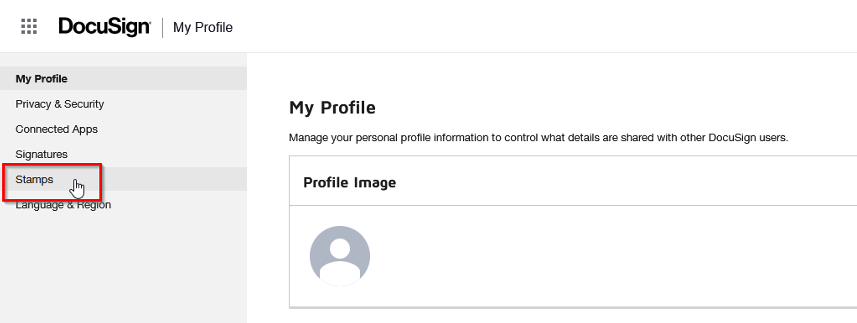 Step 1. From the Stamps section of your user profile in DocuSign, you can select Add Stamp to upload a new image.