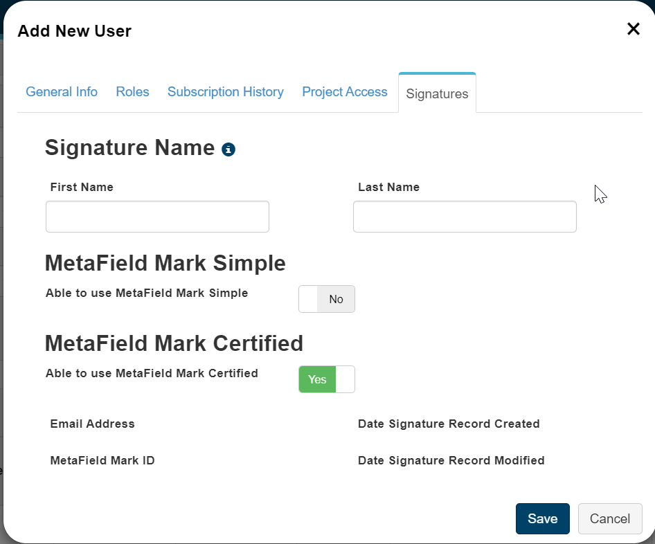 If you need to remove a user's MetaField Mark access, open the user record, navigate to the Digital Signature tab and set the Able to use Digital Signature toggle to No.