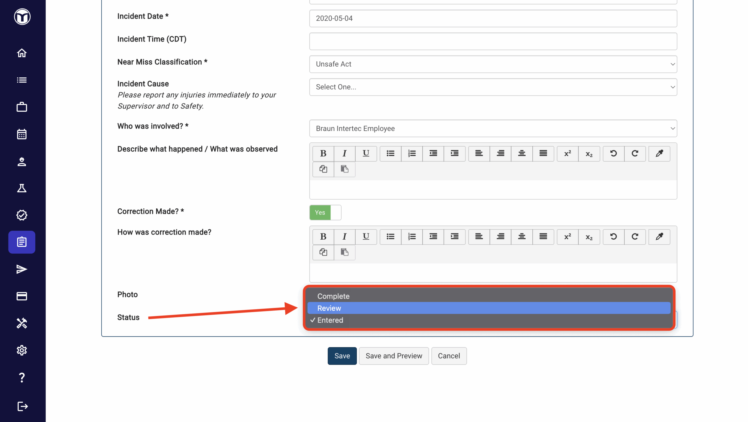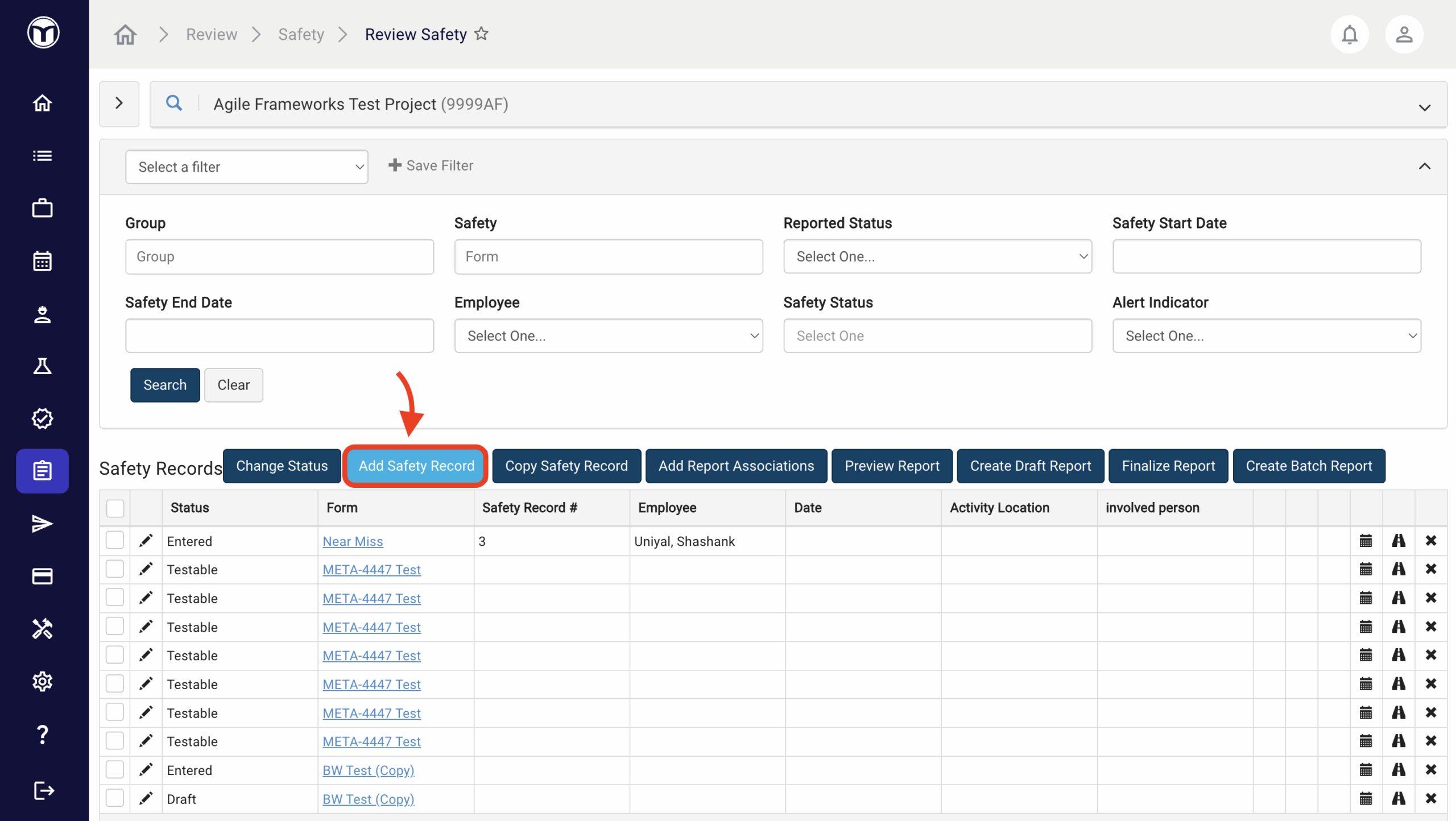 Safety records appear in Review (QC) as soon as they’re created. These records can also be created from directly within Review (QC) for more complex forms or entries.