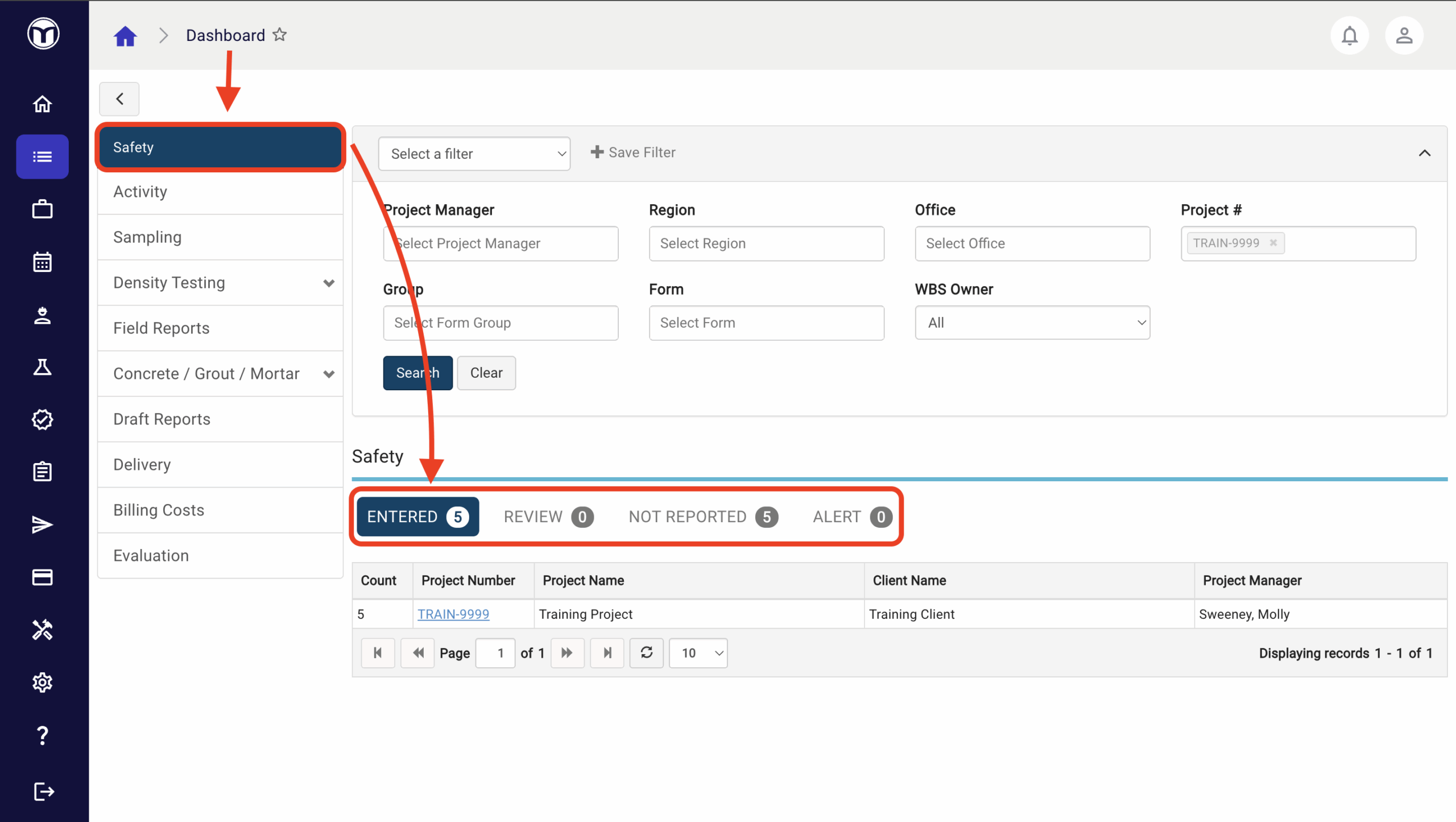 The Dashboard module displays the number of records with the Entered and Review statuses. The Not Reported status helps track which safety records still need to be reported, while the Alert status can flag safety records that require additional attention or follow-up. Clicking the Project Number link will open these records in Review (QC).