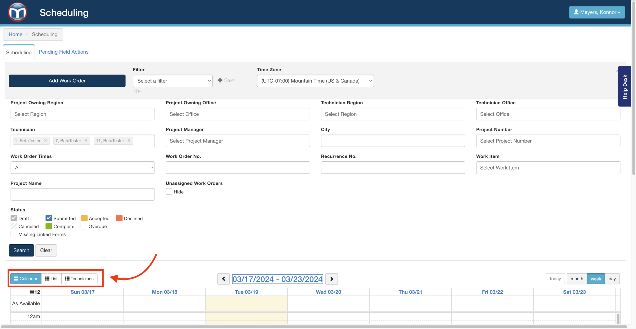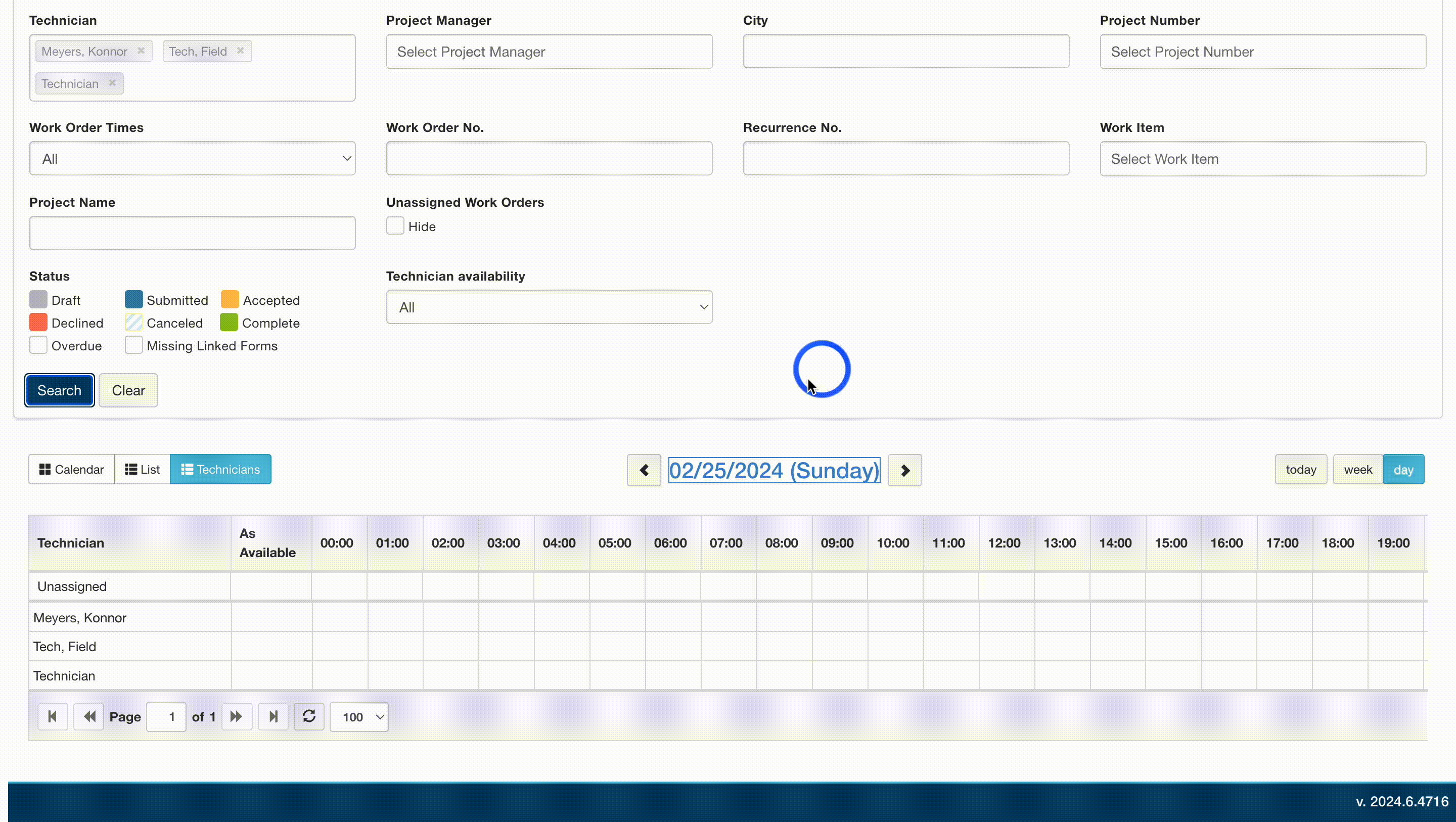 • Technician Availability: Filters techs displayed by the filter applied; available in Technician View.