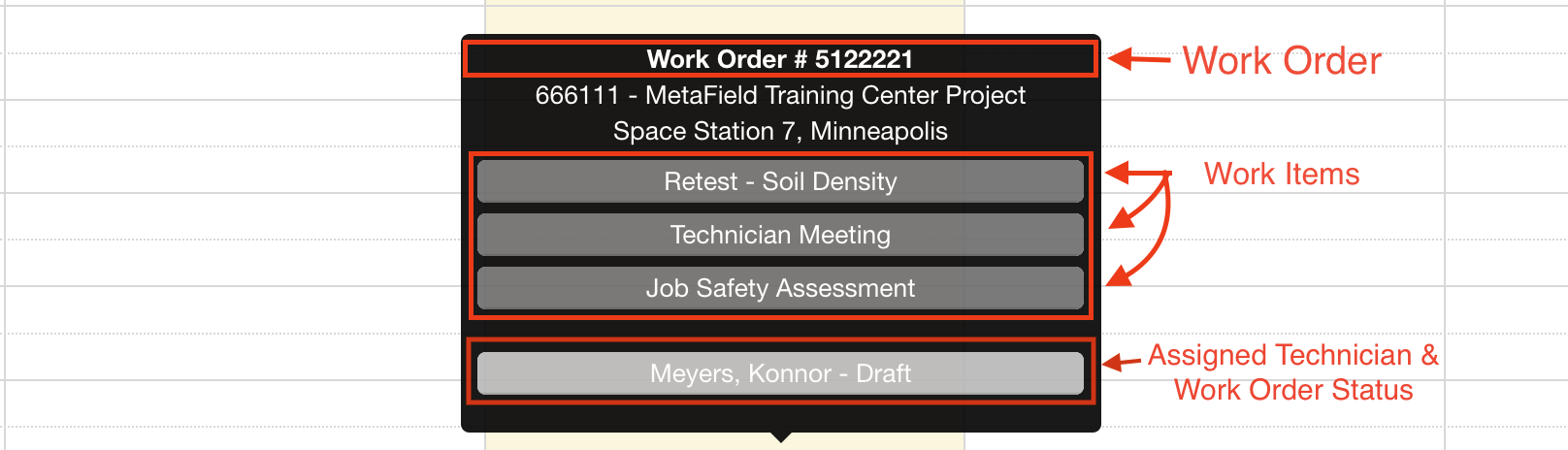 Work orders are assignments comprised of one or more individual work items, like a soil density retest or safety assessment. Your goal as a scheduler is to create these work orders, then assign them to your field technicians. Once assigned, field techs will receive a notification to review, accept, and complete the work order as instructed.