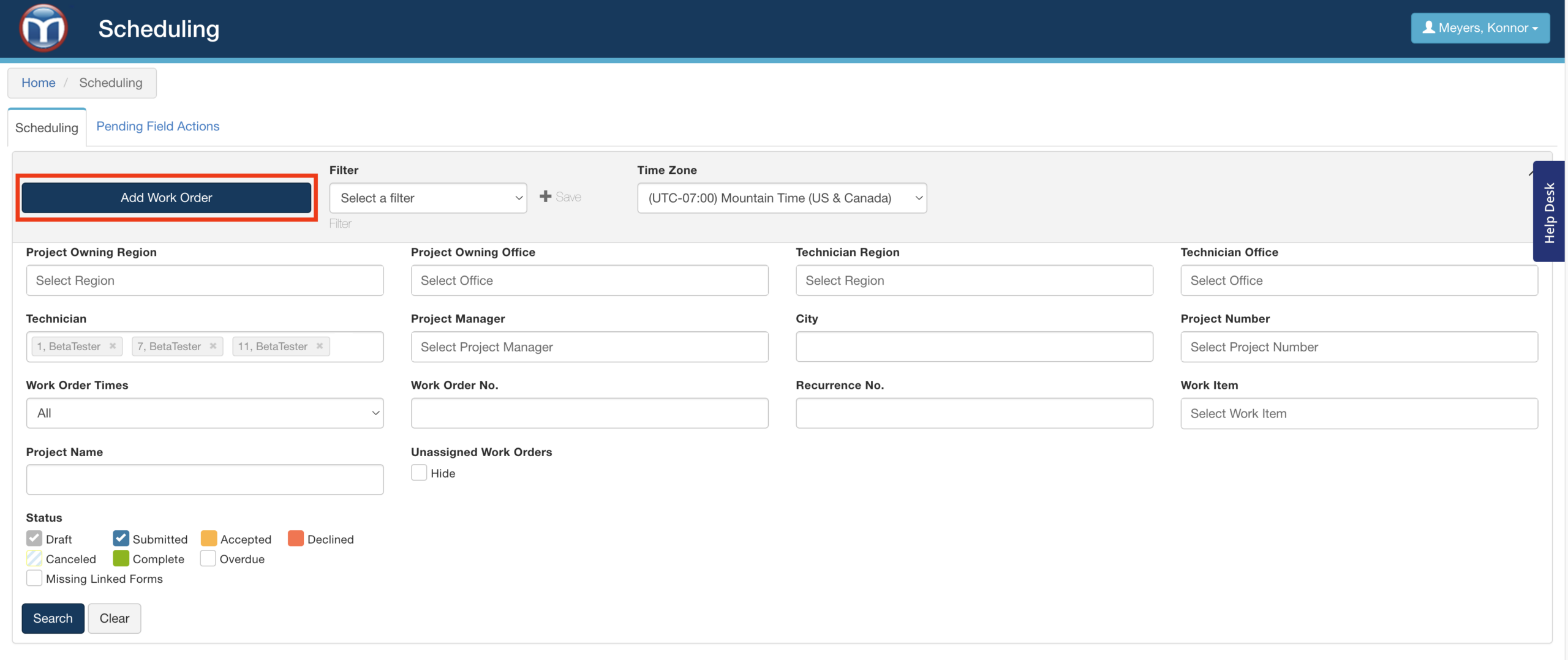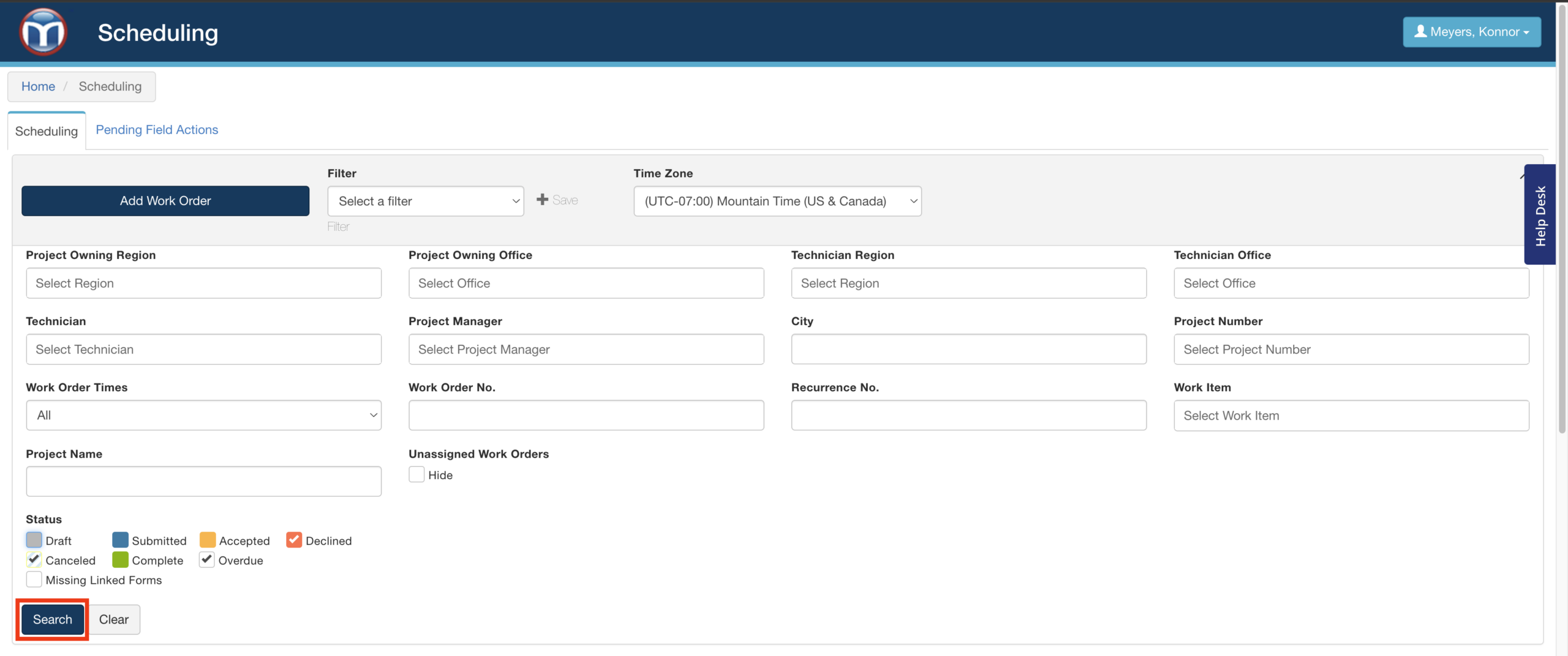 The filtering panel will help you quickly find existing work orders. You can use one or more criteria to narrow the list (like work order status, assigned technician, or project number). Click Search to apply your filter options - or reset them using the Clear button beside it.