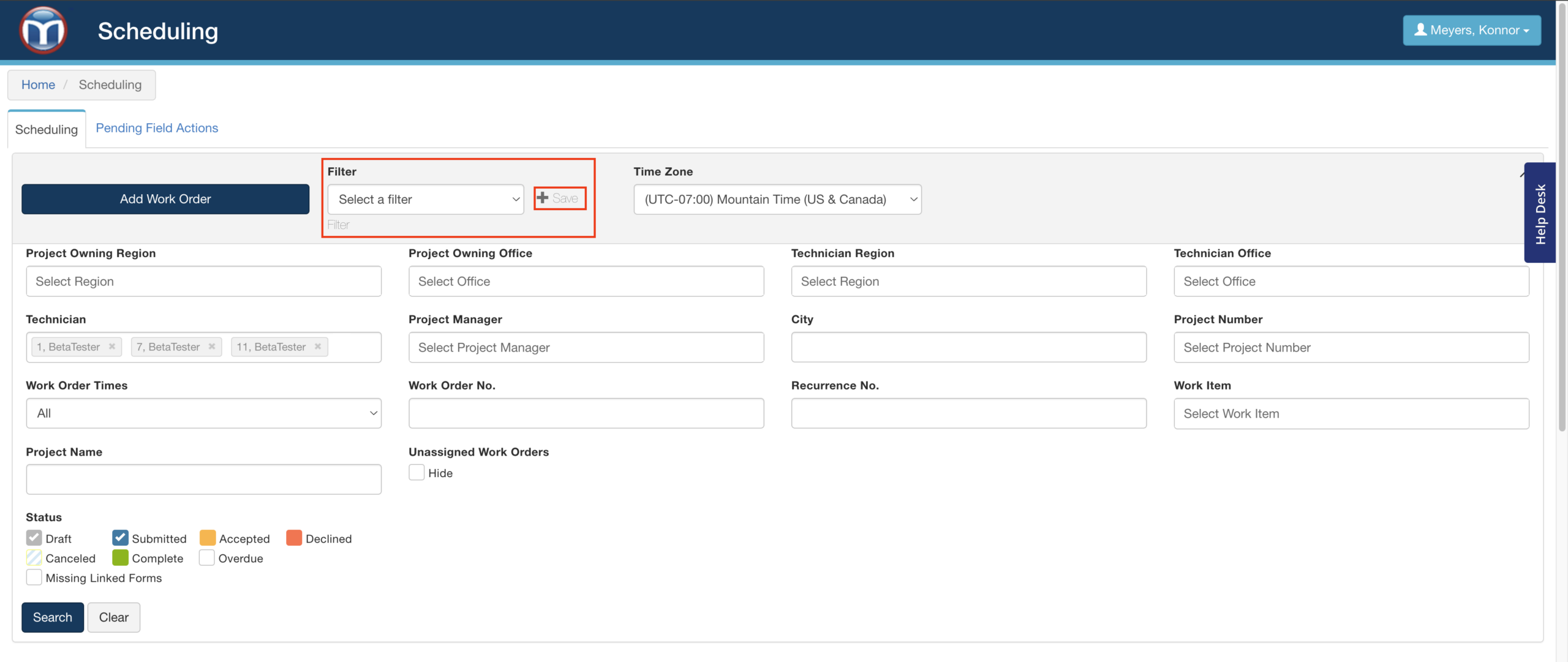 Saved filters are a great way to repeat frequent searches without having to re-enter all your options. For example, you might save filters for specific groups of technicians, project managers, and more. Experiment with this tool to save yourself time and keystrokes!