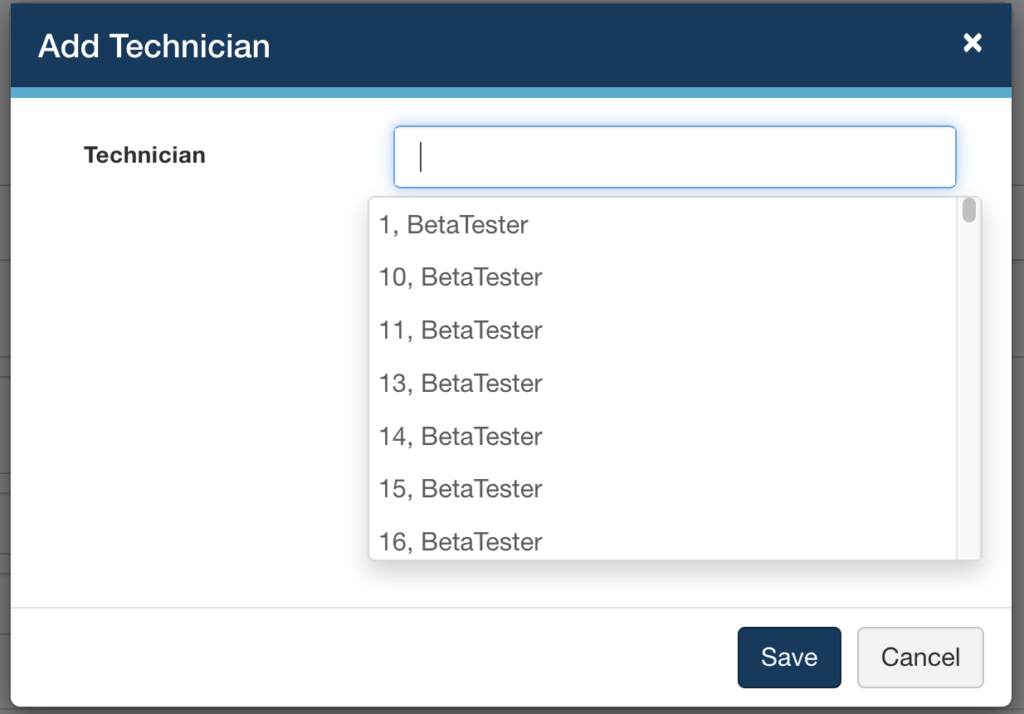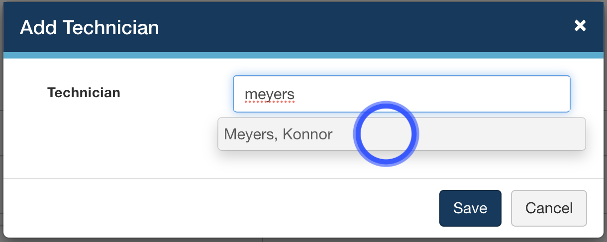 In the Add Technician window, you can type out the tech's name - or press the space bar on your keyboard to view a dropdown of all available techs based on your filters (Is Free, Certified, etc.).