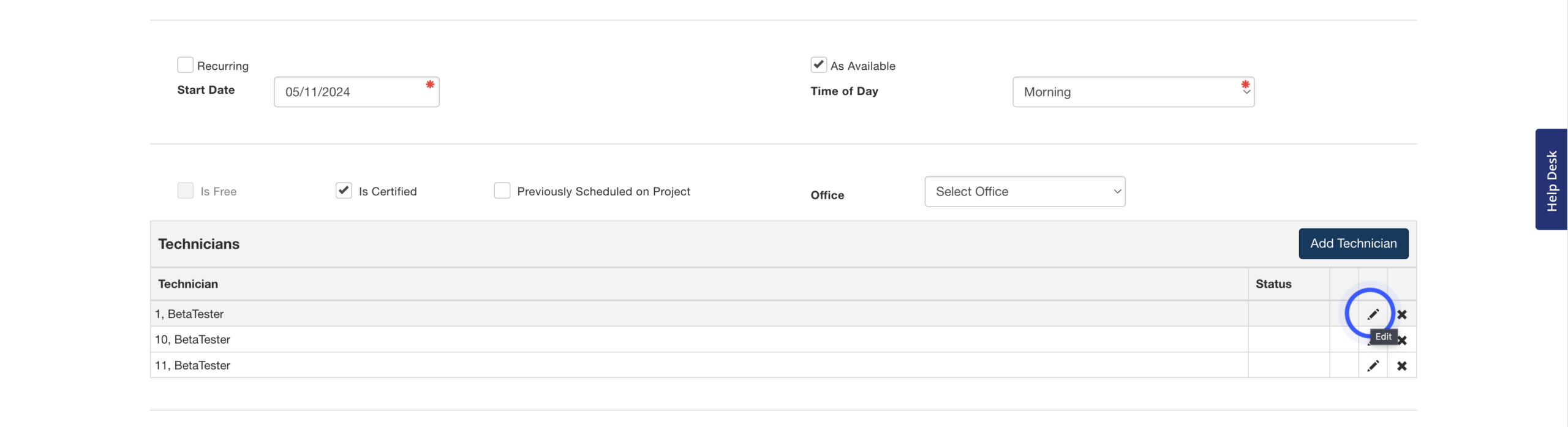 Simply repeat this process to add multiple techs to the work order. You can edit or remove added techs using the pencil and X buttons in their row.