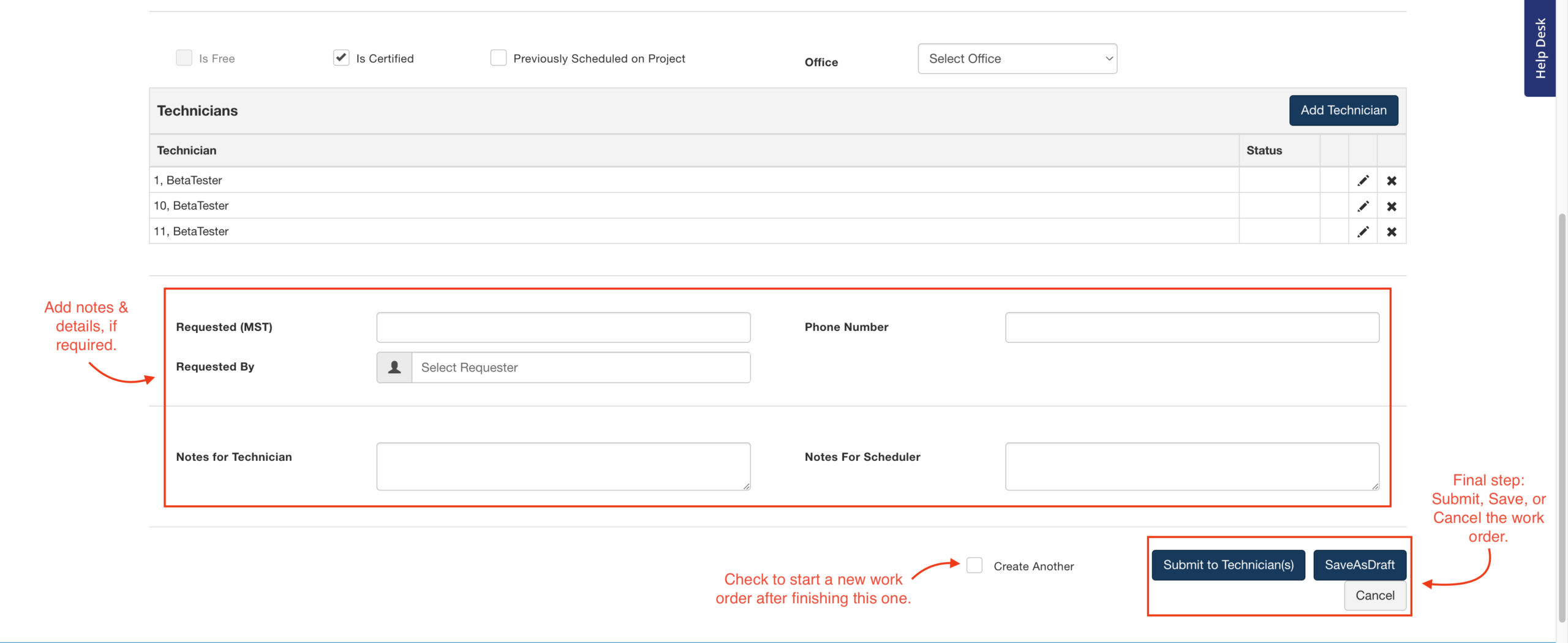 • Notes for Scheduler: The field technician will not see these notes.