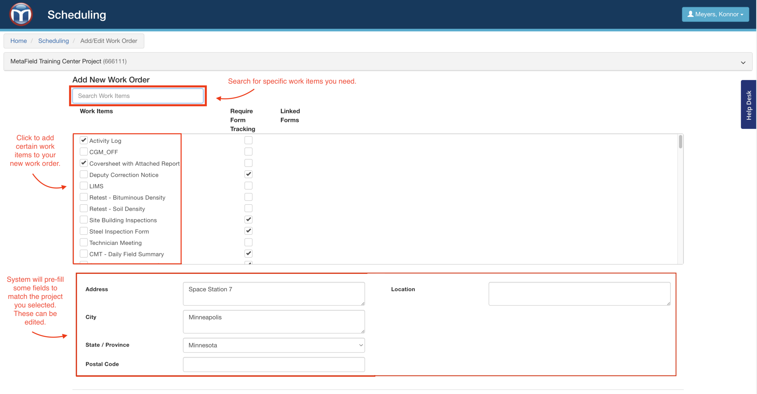 All work orders in MetaField are assigned to a specific project. So if you'd like to create a work order, you'll have to select a project first. Start by clicking Add Work Order, then choosing a project for it.