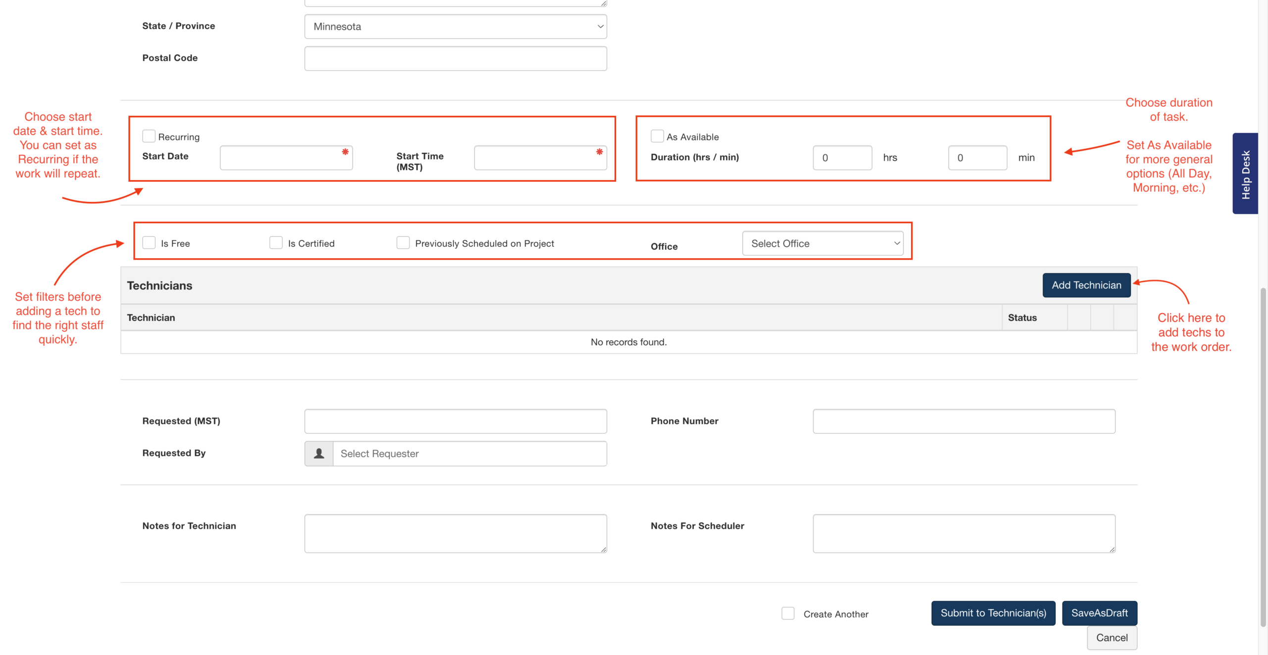 • SaveAsDraft will save your work order and give it the "Draft" status. Field techs you added will not be notified until the status is updated from Draft to Submitted.