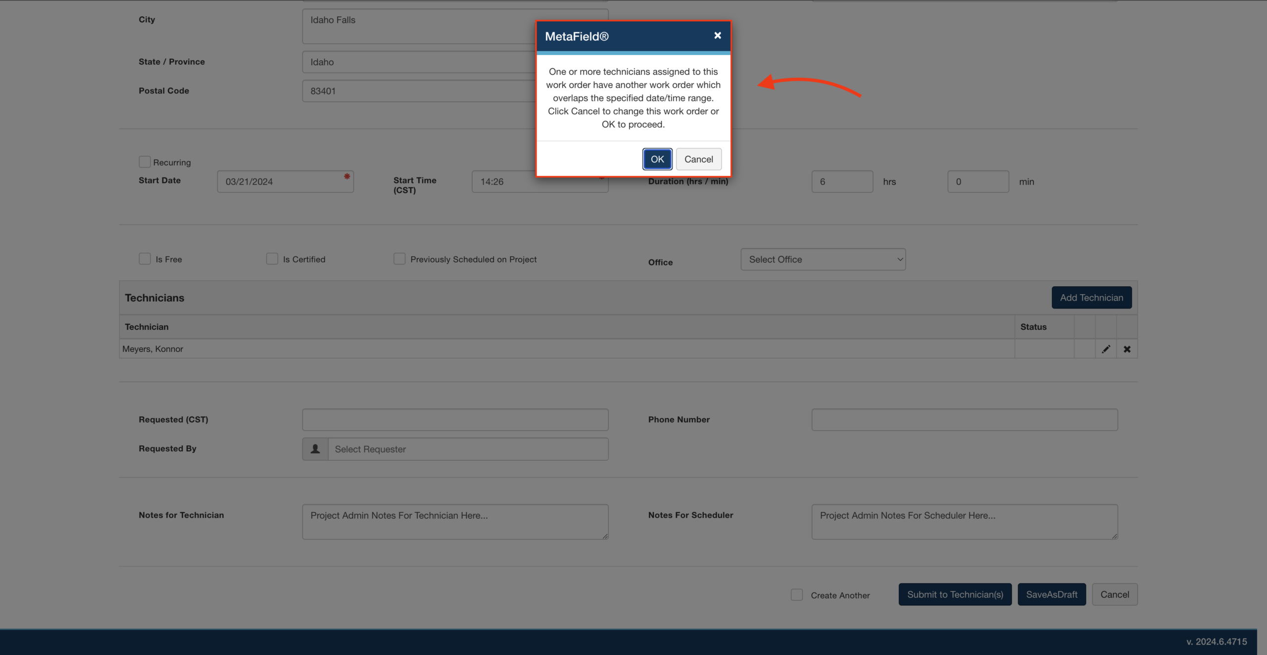 • Technician Double Booked: You assigned a tech to a work order that overlaps with another work order.