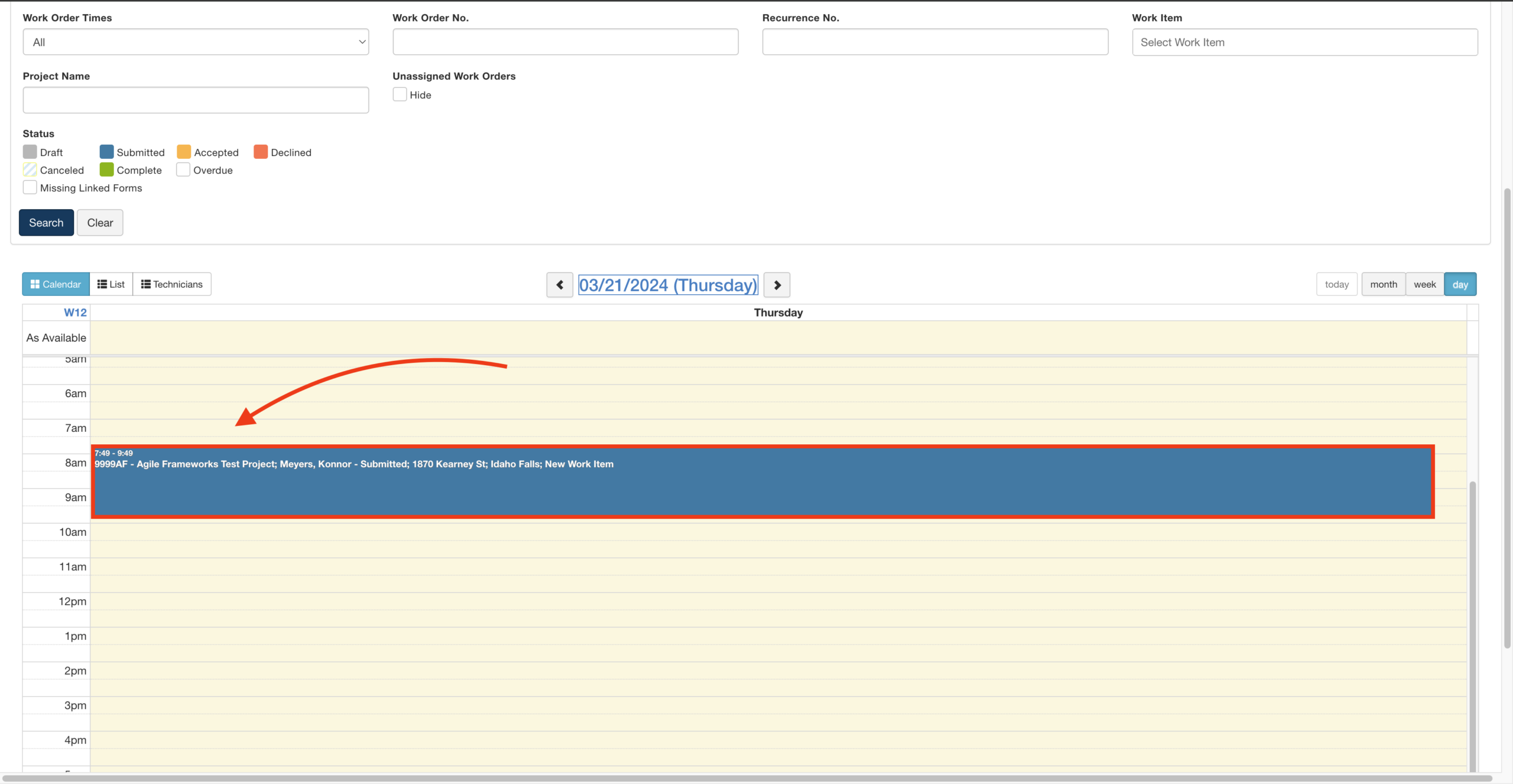 Once you create a work order, it'll appear on the schedule according to its set Start Date and Start Time: