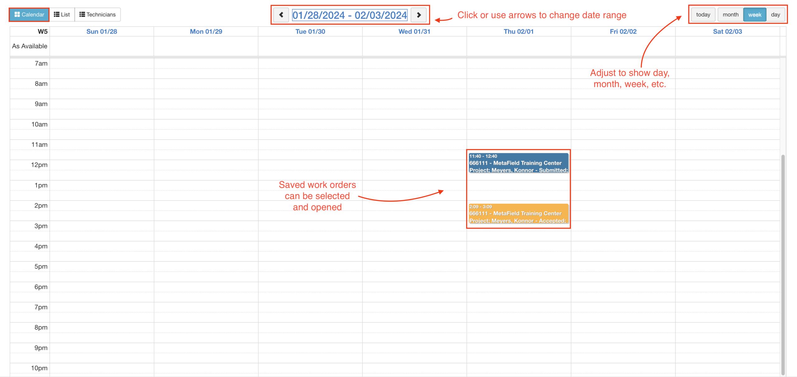 Calendar View helps visualize your schedule by date/time. It gives you a helpful snapshot of what the chosen time range looks like. This view will refresh as field techs accept, complete, or reject work orders.