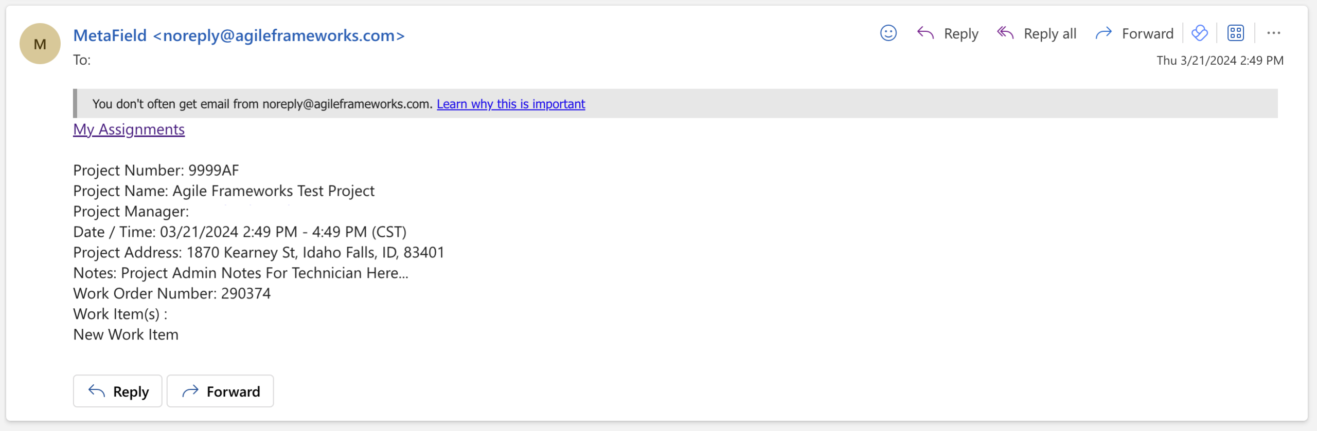 Assignees can view some details on the work order in this email, and click My Assignments to quickly access it in Field.