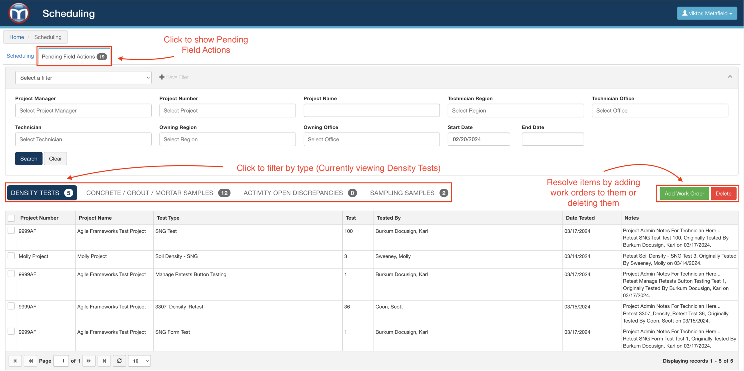Pending Field Actions (PFAs) are events in MetaField that require a follow-up action. For example, if a density test fails in Field, the system will flag it as a PFA in need of a retest. As a scheduler, you'll want to manage these actions by adding new work orders to resolve them.