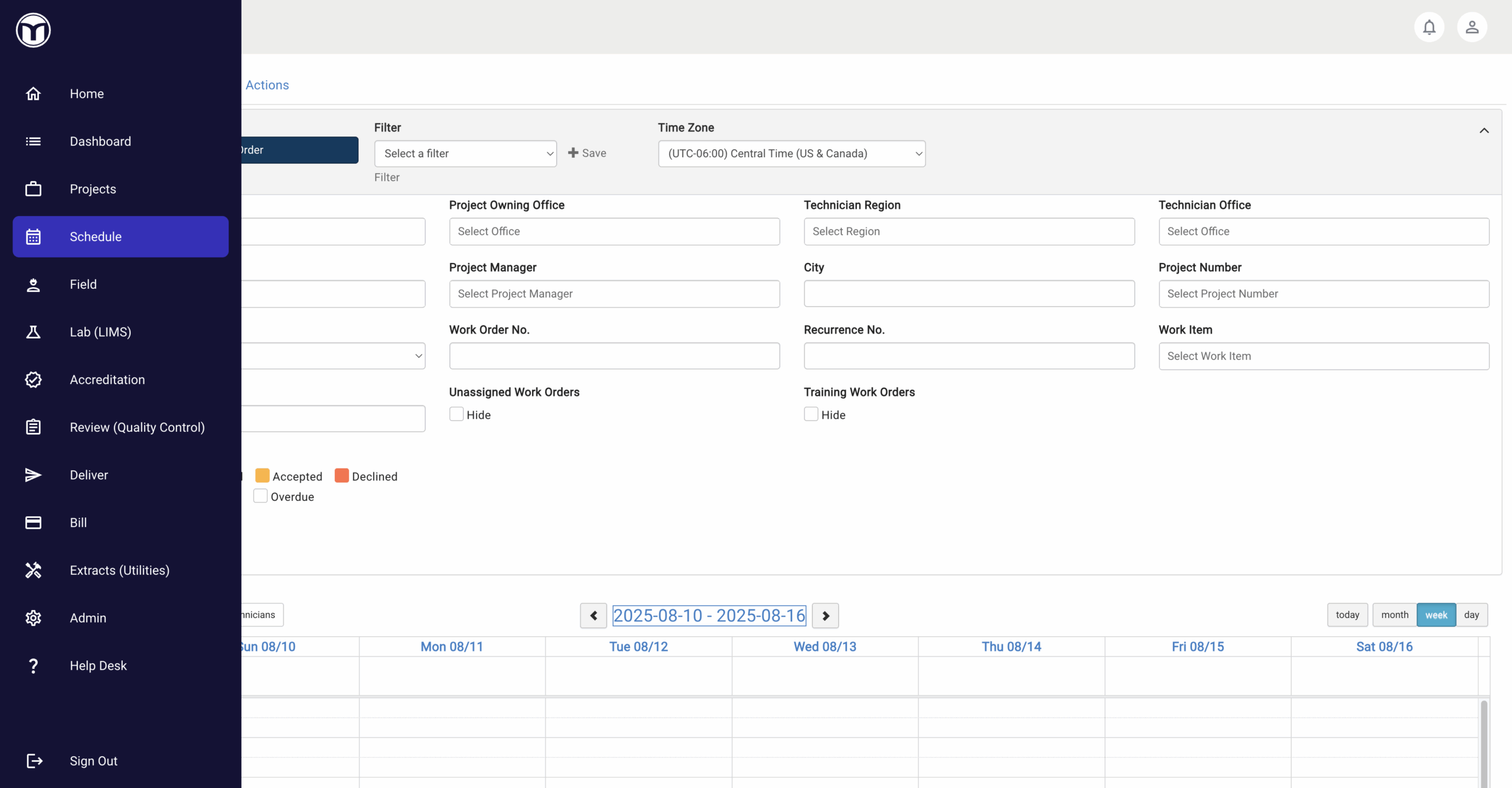 Schedule is where all work begins in MetaField. This module allows users in the scheduling role to: