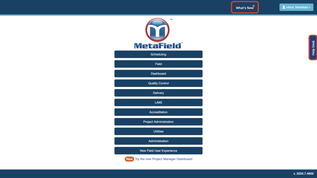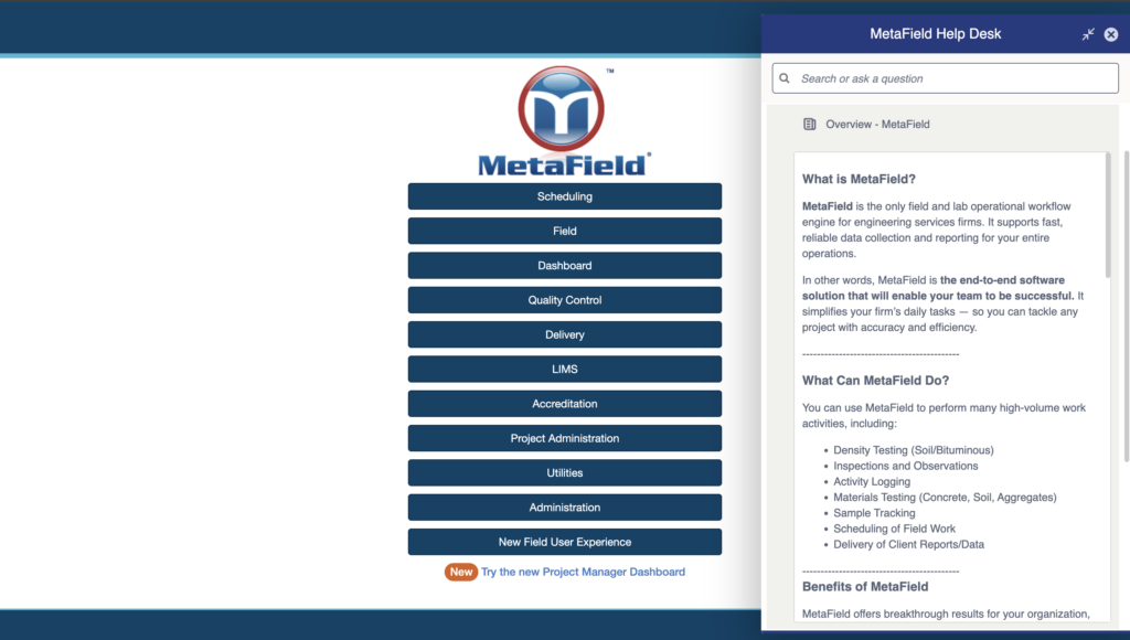 Help Desk allows users to search for in-app help resources from any page of MetaField. To try it out, click the Help Desk on the right side of your screen.